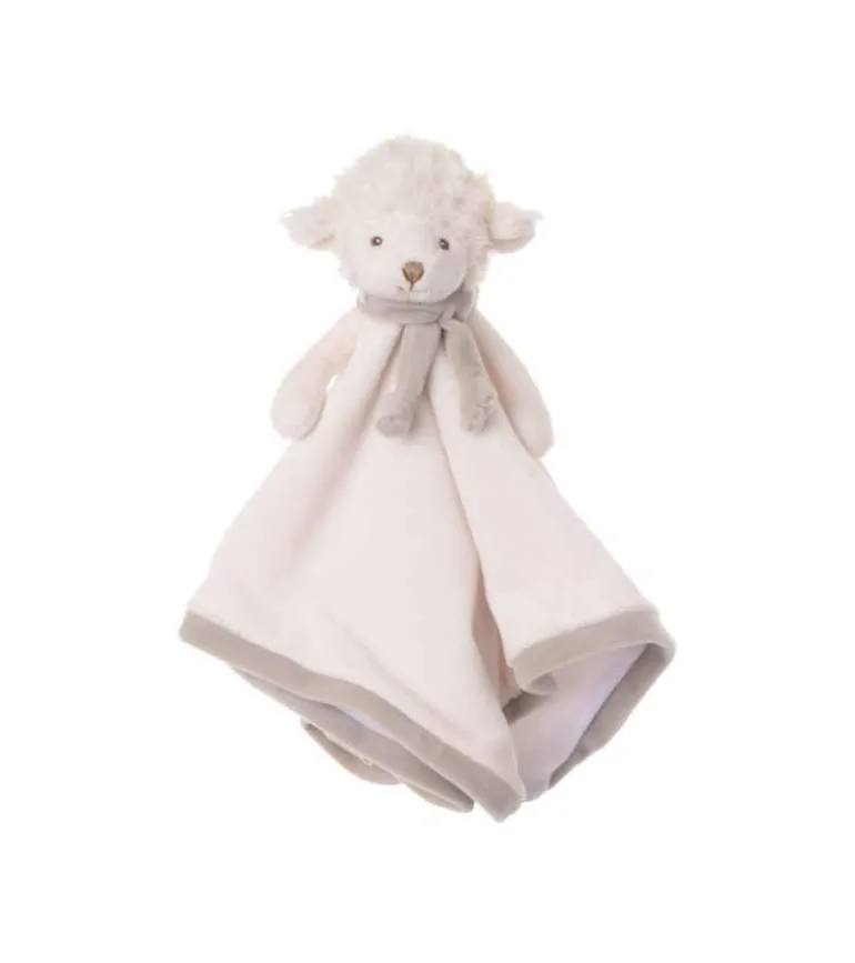 Suttekluden ligner et lam og har en hvid og beige plyspels.