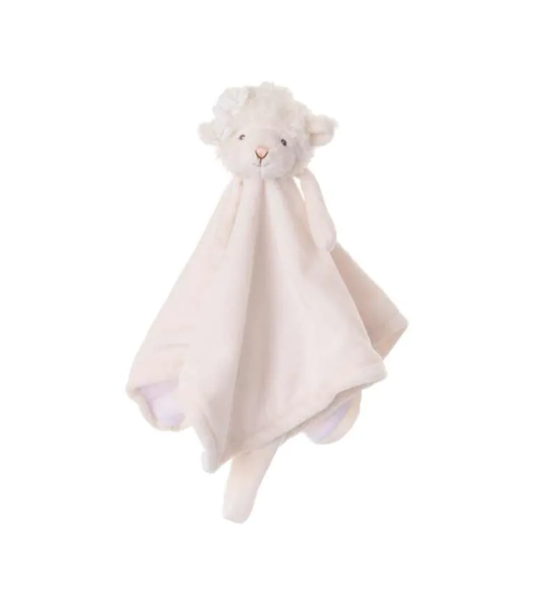 Suttekluden ligner et lam og har en hvid plyspels med rosa kinder.