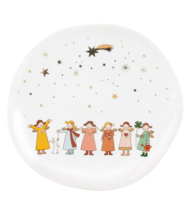 Hyggelig tallerken med 6 små glade engle. Over dem er en smuk stjernehimmel.