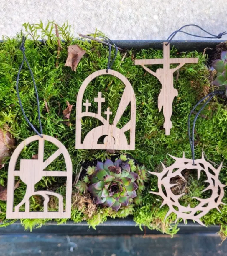 Ophænget er vores fortolkning af Langfredag, hvor de romerske soldater lavede en krone ud af nogle grene fra en tornebusk. De gav Jesus den på, imens spottede ham og råbte” Hil dig, Jødekonge! Mark. 15,16-20